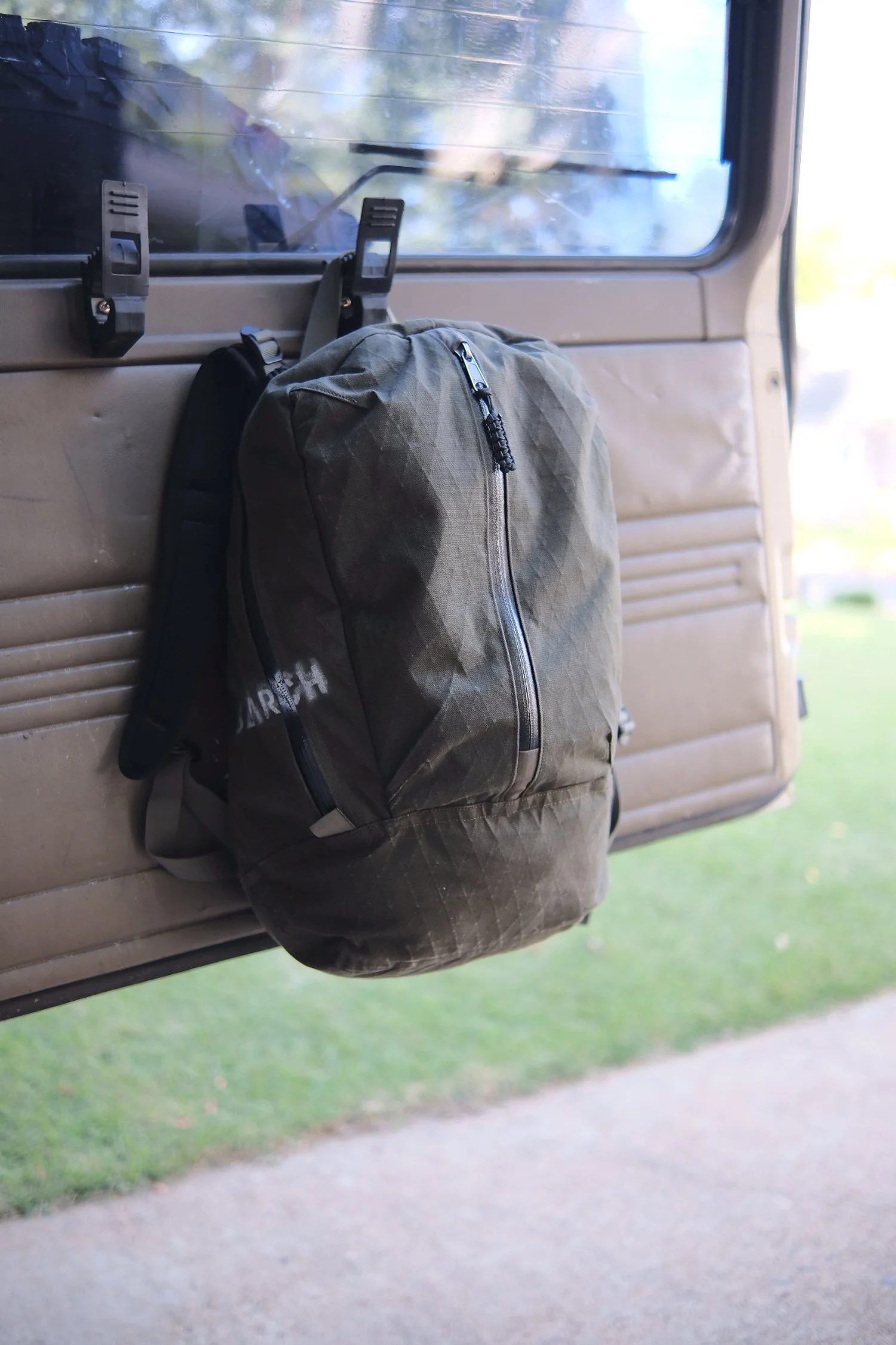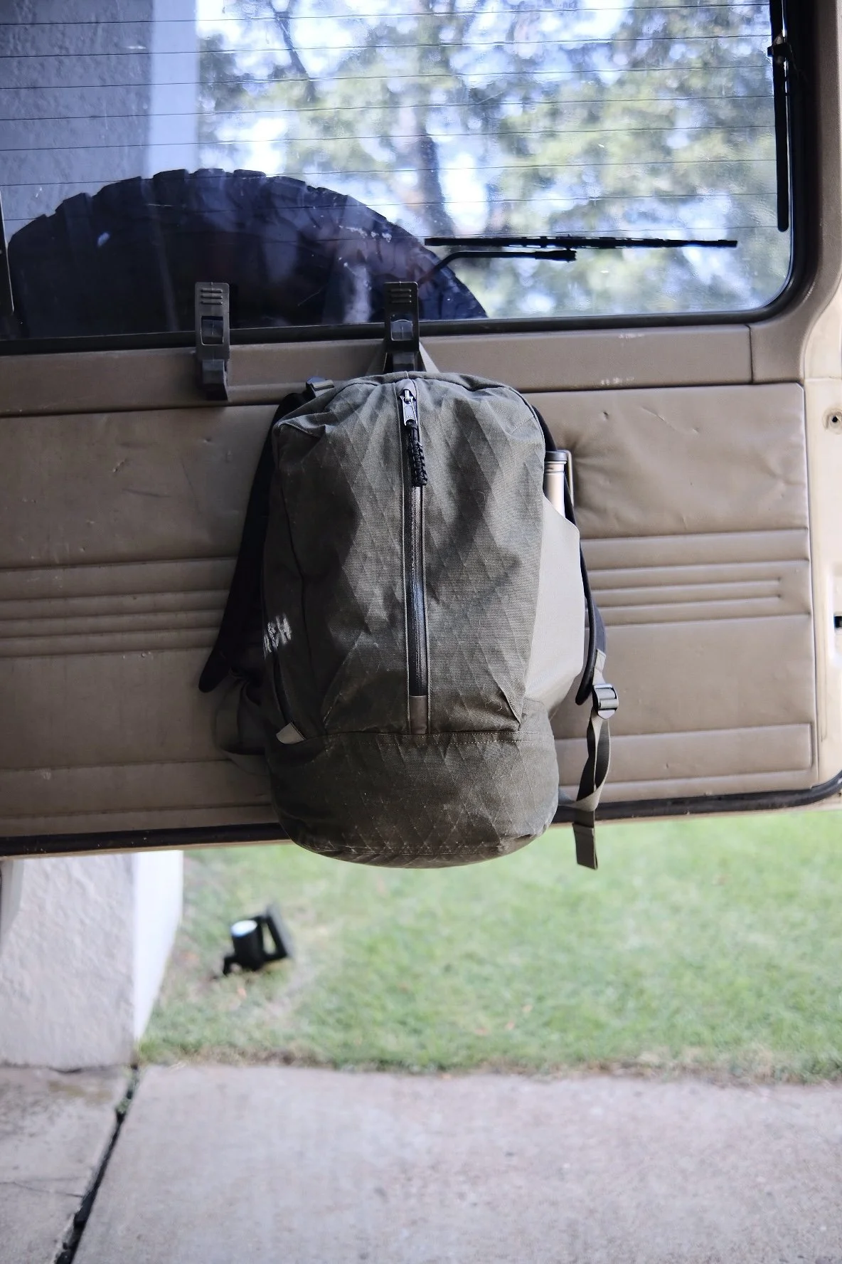 This 30L backpack has evolved from a base shaped I have worked on for a while. It is striking a balance between sitting on the back in a ergonomic and aesthetic way, while also standing up when set down and holding gear well. It is constructed with X-Pac with a cotton duck face, Tweave stretch side pocket, and water resistant YKK zippers. All the seams are either felled and seam sealed or bound and sealed with an adhesive.